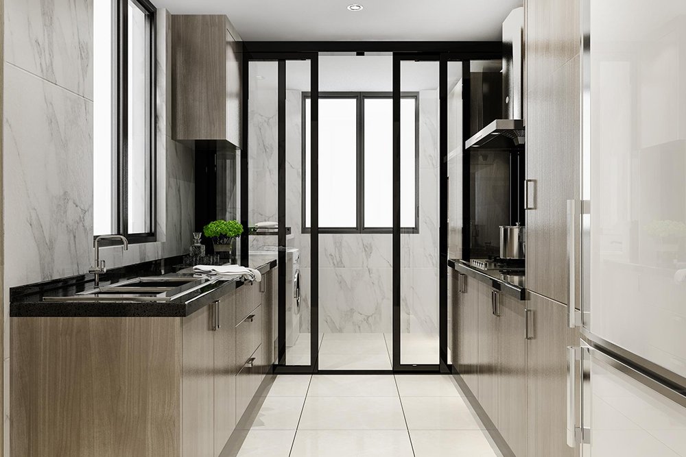 It is excellent for narrow rooms, as it uses both walls effectively. The design separates the wet and dry areas, making maintenance easier and keeping the kitchen visually tidy.