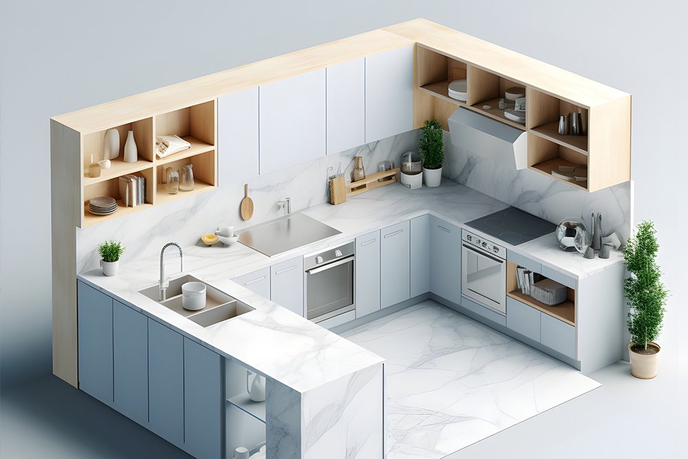 This layout maximizes corner space and offers ample countertop area for meal preparation. It also provides flexibility to add additional elements like a breakfast counter or storage units.